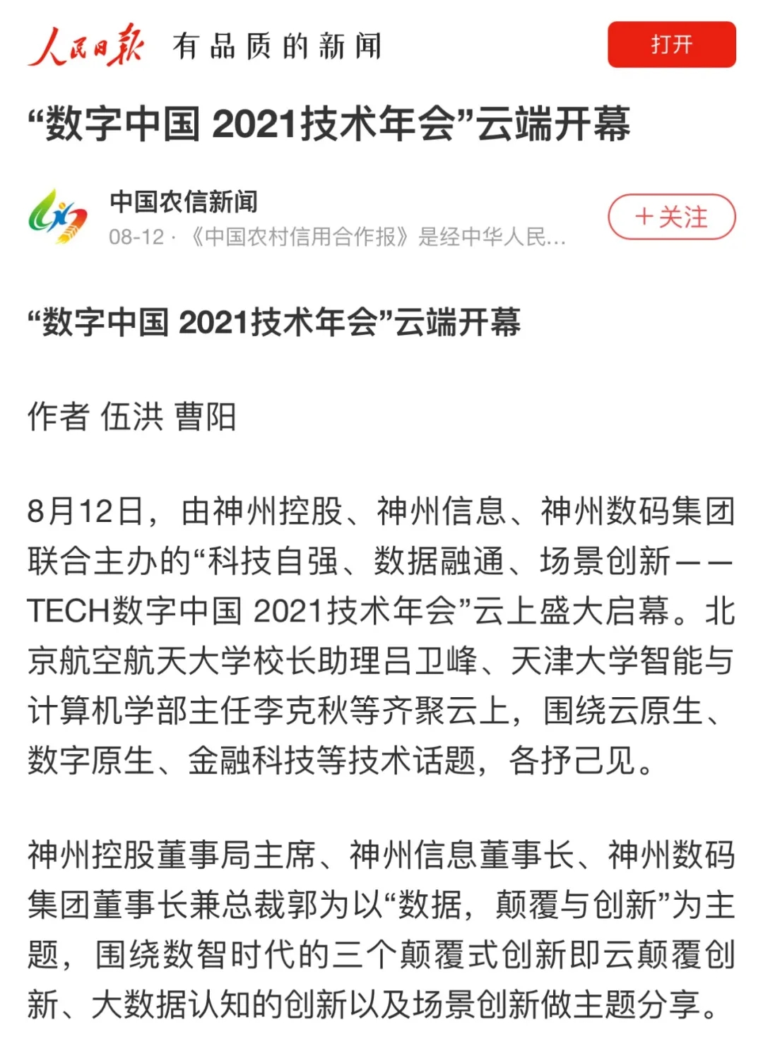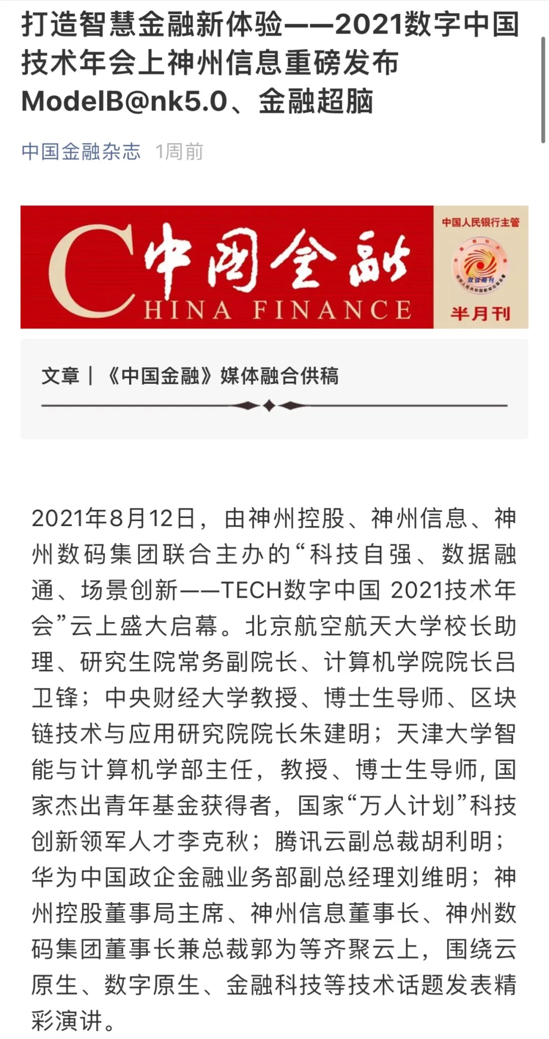 8月12日,由神州控股、神州信息、710公海寰宇集团联合主办的“科技自强、数据融通、场景创新——TECH数字中国 2021技术年会”云上盛大启幕,发布神州信创云、ModelB@nk5.0、金融超脑Sm@rtFSB、云原生数字化安全底座、园区智能体等重磅产品,国内各大权威、影响力媒体多角度多频次对盛况进行报道!